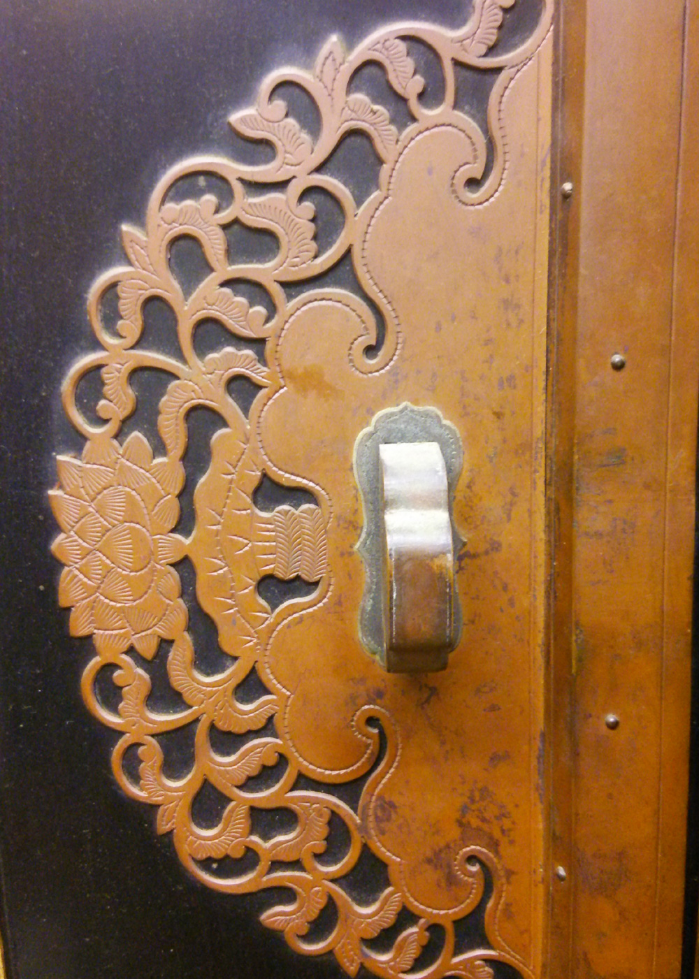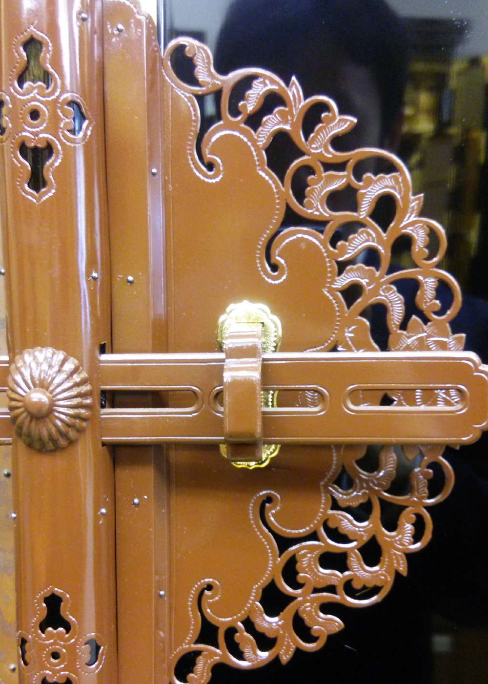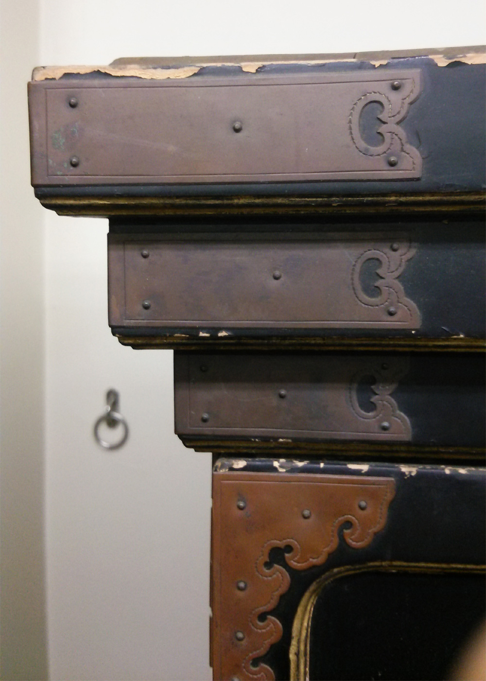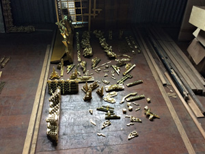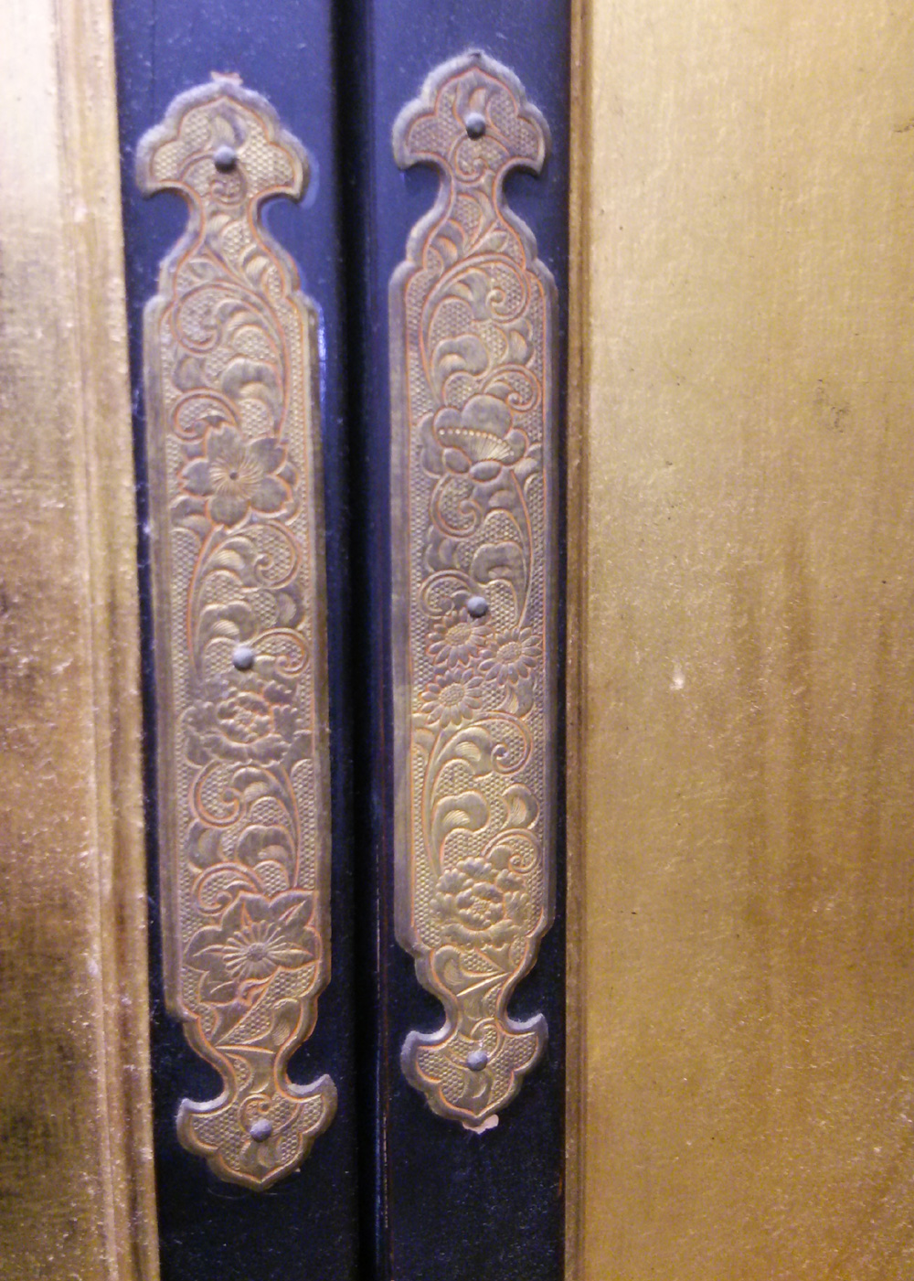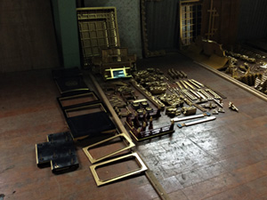 - 解体し、全て外した錺金具に「金メッキ」や漆の焼き付け等による「色着け」を施した後、元の場所にまた打ち付けていきます。