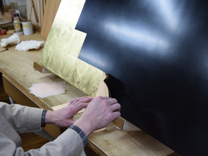 - 上塗りを十分に乾燥させた後、専門の竹箸を使い金箔を押していきます。(金箔を貼ることを「金箔を押す、または置く」という)金箔は 金の地金を10000分の1ミリという薄さにしたもので、少しの風でも飛んでいってしまうため、風の通りのない状況での作業が必要になります。