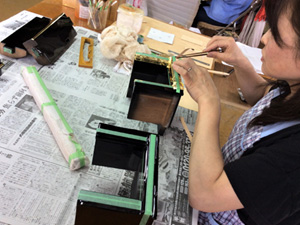 - 「塗り」が綺麗に仕上がるかどうかはこの「下地・研磨」の工程にかかっています。木地のヘコミや塗り部分の割れ等にパテを埋め 研磨し、下地を塗り、また研磨するという作業をします。