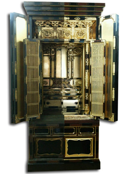 - 当店に展示してあります「洗濯見本のお仏壇」も「本漆」を使用した仕上げになっておりますので、是非一度「本漆の刷毛塗り」と 「合成樹脂塗料の吹付」を見比べていただければ幸いです。