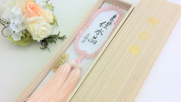 女性に大変人気のある紅水晶の念珠です。優しくかわいらしい雰囲気があり、年齢問わずに人気の商品です。 そのため、安価な粗悪品もよく」で回っていますが、当店の商品は安心の「京念珠」製品をご提供させていただいております。