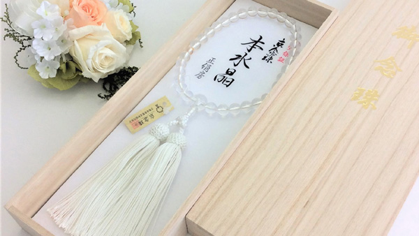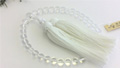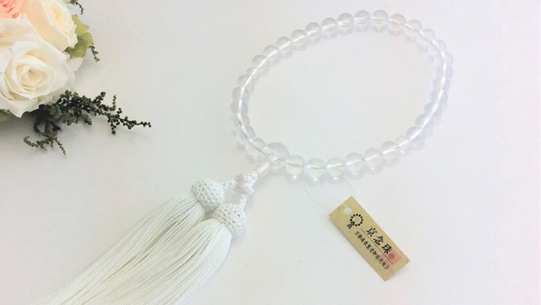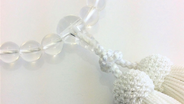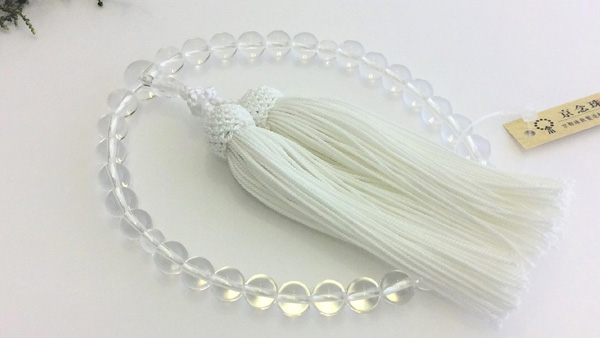 女性念珠の定番、本水晶です。本水晶、白房の組み合わせ はシンプルだからこそ、素材の良し悪しがとても重要です。