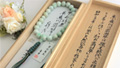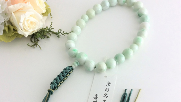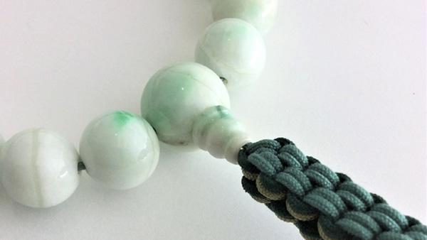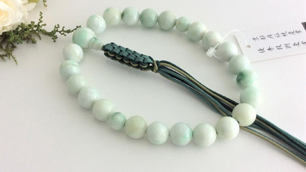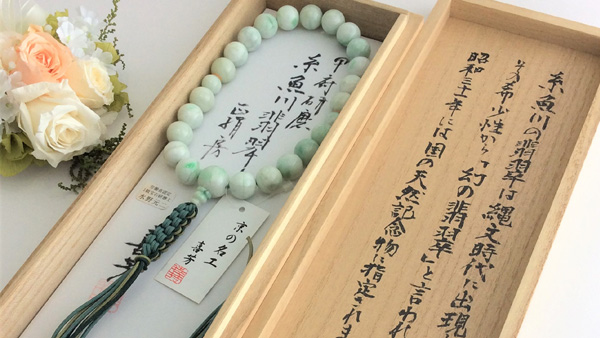 国の天然記念物として指定されている糸魚川翡翠の念珠です。現在、採取が禁止になっており大変貴重な商品です。 山梨県の一級宝石研磨士によって一つ一つ丹精に磨き上げられたもので、まさに至極の一品物です。